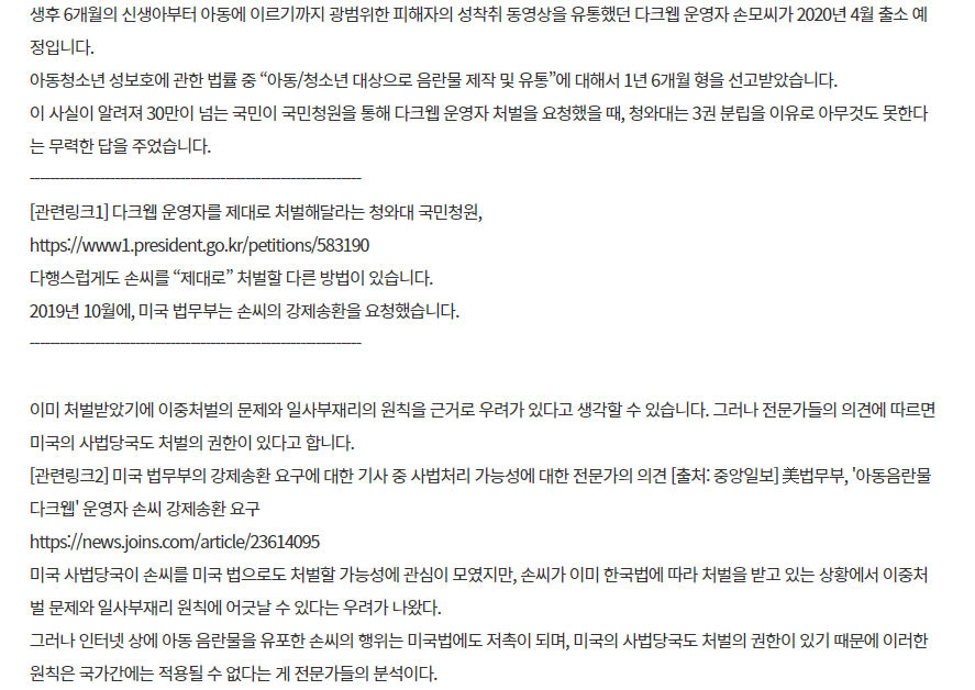 떠들썩했던 다크웹 운영자 손정우에 대한 소식입니다.