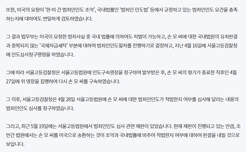 하지만 미국 법무부는 손정우를 미국으로 보내 달라고 요구하며 인도구속영장이 발부되어 수감 상태를 이어왔습니다.
