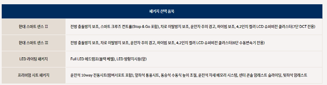 전방 충돌방지 보조, 차로 이탈방지 보조, 운전자 주의 경고, 하이빔 보조, 4.2인치 컬러 LCD 슈퍼비전 클러스터(6단 수동변속기 전용)