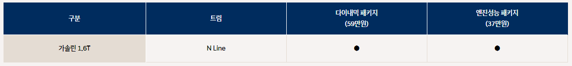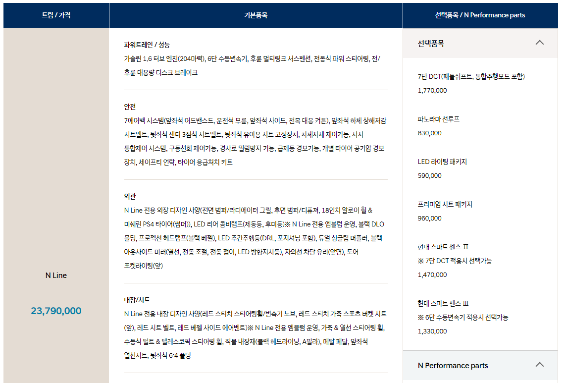 N Line 전용 외장 디자인 사양(전면 범퍼/라디에이터 그릴, 후면 범퍼/디퓨져, 18인치 알로이 휠 & 미쉐린 PS4 타이어(썸머)), LED 리어 콤비램프(제동등, 후미등)※ N Line 전용 엠블럼 운영, 블랙 DLO 몰딩, 프로젝션 헤드램프(블랙 베젤), LED 주간주행등(DRL, 포지셔닝 포함), 듀얼 싱글팁 머플러, 블랙 아웃사이드 미러(열선, 전동 조절, 전동 접이, LED 방향지시등), 자외선 차단 유리(앞면), 도어 포켓라이팅(앞)