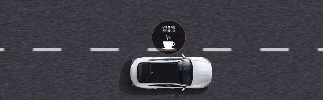 차량이 스스로 운전자의 주행 패턴과 차로 내 차량 위치 등을 종합적으로 분석하여 주의 운전이 필요하다고 판단되면, 팝업메시지와 경고음을 통해 운전자 휴식 유도.