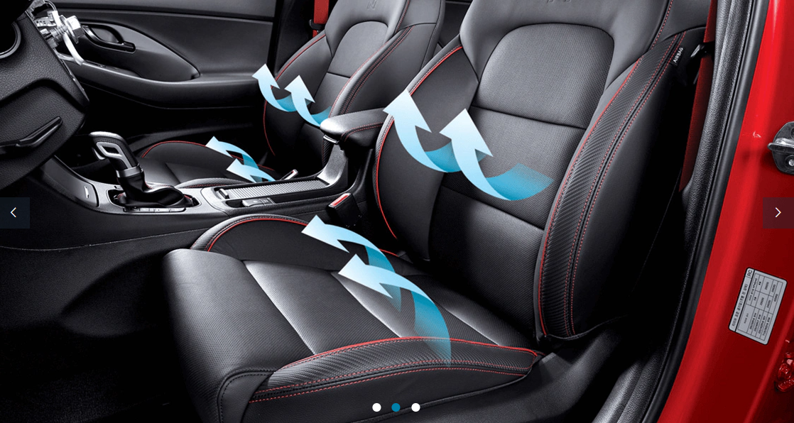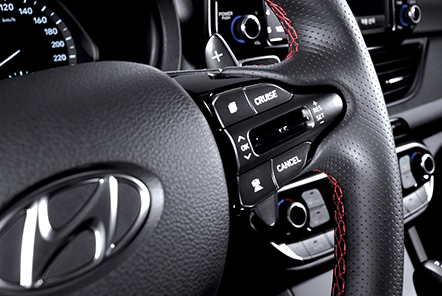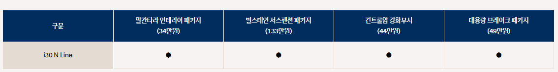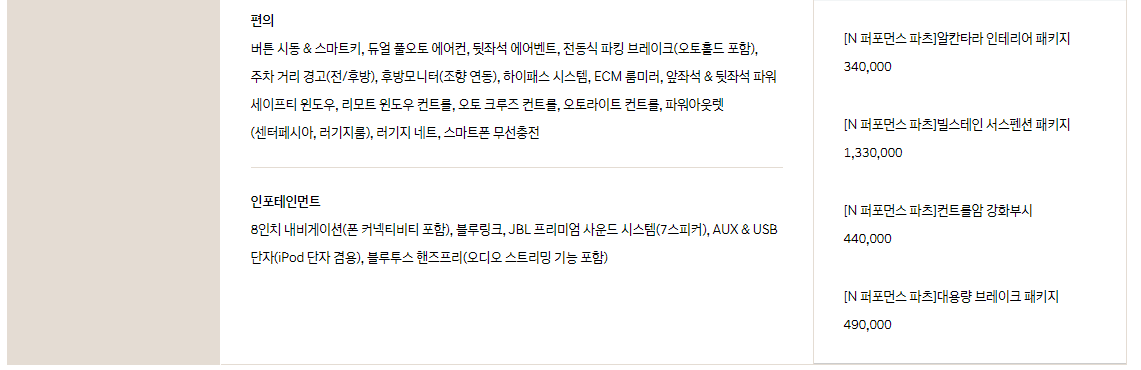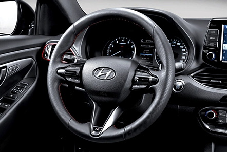 N Line 전용 내장 디자인 사양(레드 스티치 스티어링휠/변속기 노브, 레드 스티치 가죽 스포츠 버켓 시트(앞), 레드 시트 벨트, 레드 베젤 사이드 에어벤트)※ N Line 전용 엠블럼 운영, 가죽 & 열선 스티어링 휠, 수동식 틸트 & 텔레스코픽 스티어링 휠, 직물 내장재(블랙 헤드라이닝, A필라), 메탈 페달, 앞좌석 열선시트, 뒷좌석 6:4 폴딩