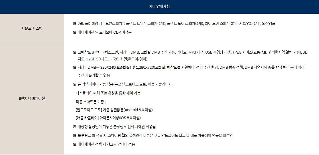 8인치 내비게이션(폰 커넥티비티 포함), 블루링크, JBL 프리미엄 사운드 시스템(7스피커), AUX & USB 단자(iPod 단자 겸용), 블루투스 핸즈프리(오디오 스트리밍 기능 포함)