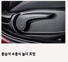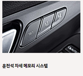 운전석 10way 전동시트(럼버서포트 포함), 앞좌석 통풍시트, 동승석 수동식 높이 조절, 운전석 자세 메모리 시스템, 센터 콘솔 암레스트 슬라이딩, 뒷좌석 암레스트