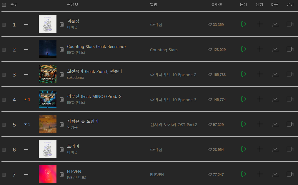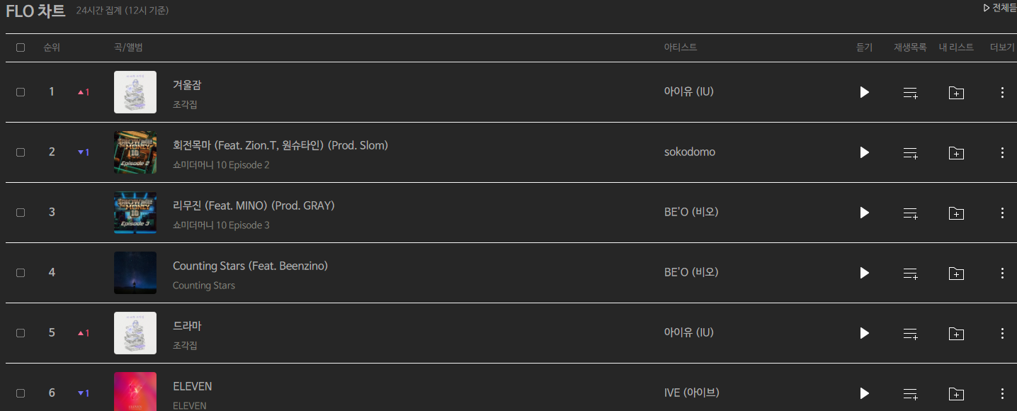 제일 인기있는 음악 사이트 멜론에서 조각집 타이틀곡 겨울잠이 1위를 차지했습니다.