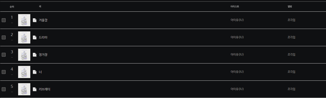 벅스뮤직 차트에서도 조각집의 모든 수록곡이 1~5위를 차지했습니다.