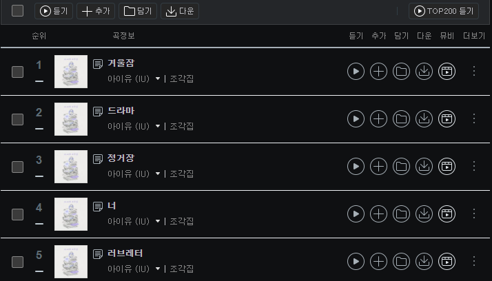 아이유 새 앨범 조각집 타이틀곡 겨울잠 차트 1위