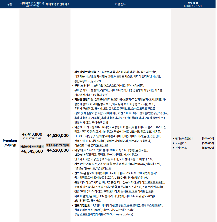 차박 시에 실내 조명 밝기를 줄여주는 ‘실내 조명 최소화’, 급속 충전 성능을 최적의 상태로 유지해주는 ‘배터리 컨디셔닝’, 충전 잔여량에 따라 공조를 최적화해주는 ‘주행거리 중심 공조제어’, 배터리 잔량과 목적지까지의 이동 거리를 분석해 충전 필요 시 최적의 충전소를 경유지로 안내해주는 ‘EV 경로 플래너’ 등 전기차 특화 기능을 적용하였습니다.