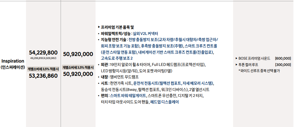 * BOSE 프리미엄 사운드 시스템 (8스피커) : 센터 스피커(1개), 프런트 트위터 스피커(2개), 프런트 도어 스피커(2개), 리어 도어 스피커(2개), 우퍼 스피커(1개), 외장앰프
